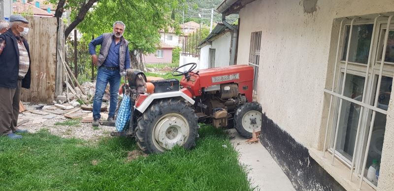 Afyonkarahisar’ın Dinar ilçesinde 88 yaşındaki adam kullandığı traktörün kontrolünü kaybedince kendi evine girdi. Çarpmanın etkisi ile aracın lastiğinin biri evin duvarının içinde kaldı.