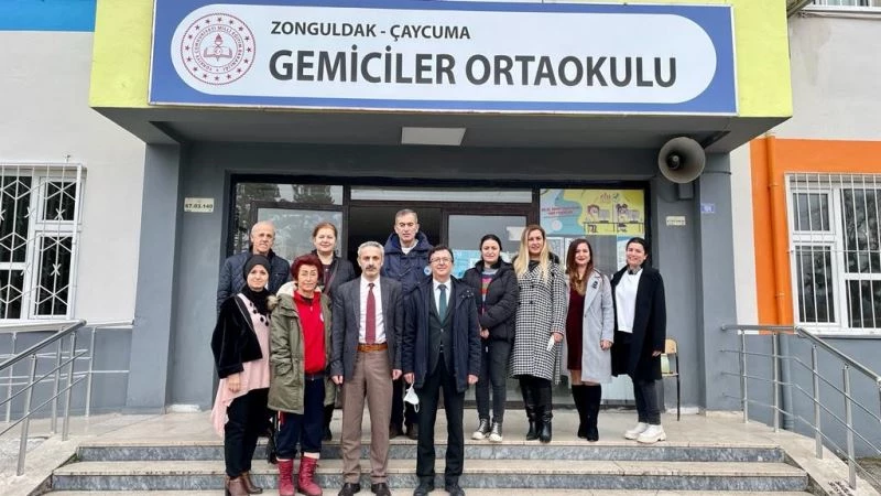 Çaycuma Kent Konseyi Başkanı Tuğrul Dereli, Yürütme Kurulu Üyeleri Nizamettin Eyidoğan, Recep Kabuk ile Kadın Meclisi Başkanı Ayla Kalaycı, Yürütme Kurulu Üyeleri Yonca Girgin, Yeliz Alagöz, Nurdan Candan, Songül Ertuğrul, Halk Oyunları Çalışma Grubu Başkanı Nilgün Çelik, Gemiciler Ortaokulunu ziyaret etti.