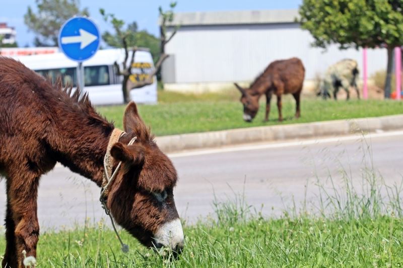 Antalya’da sokağa çıkma kısıtlamasının son gününde boşluğu fırsat bilen eşek ve keçiler, park ve refüjlere gelerek otladı.
