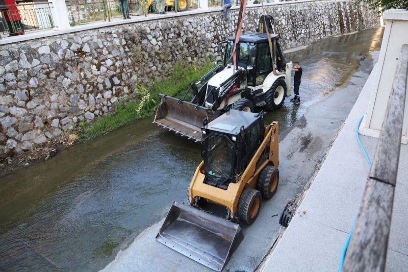 Kepçeler vinç yardımı ile dereye indirilip temizlik çalışması başlatıldı