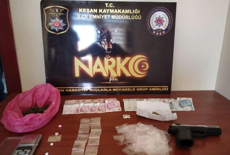 Keşan İlçe Emniyet Müdürlüğü, Narkotik Suçlarla Mücadele Grup Amirliği ekipleri tarafından 22 Ağustos Cumartesi günü, Keşan’da uyuşturucu madde ticaretinin yoğun olarak görüldüğü mahallelerde, uyuşturucu madde ticareti yapan şahısların barındığı ve içinde uyuşturucu ticaretinin yapıldığı tespit edilen 5 ayrı adrese operasyon düzenlendi. B.G. isimli şahsın evinde yaptığı aramalarda, 3 adet kilitli poşet içerisinde 1.40 gr. eroin maddesi, 1 adet poşet içinde 31.27 gr. esrar maddesi, 4 adet uyuşturucu hap, 1 hassas terazi, 2 bin 300 TL nakit para ve 143 adet de uyuşturucu madde paketlemede kullanılan kilitli poşet ele geçirdi.