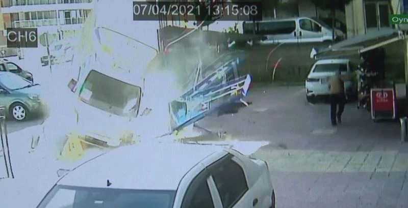 Öte yandan meydana gelen kaza, marketin güvenlik kameraları tarafından saniye saniye görüntülendi. Görüntülerde freni boşalan kamyonetin süratle gelip önce otoparkın duvarına ve market tabelasına vurduğu, daha sonra da marketin de bulunduğu otoparka düştüğü görüldü. Ayrıca görüntülerde otoparkın yanında bekleyen bir kişinin ve marketten çıkan müşterinin, kamyonetin altında kalmaktan saniyeler farkıyla kurtulduğu da görüldü.