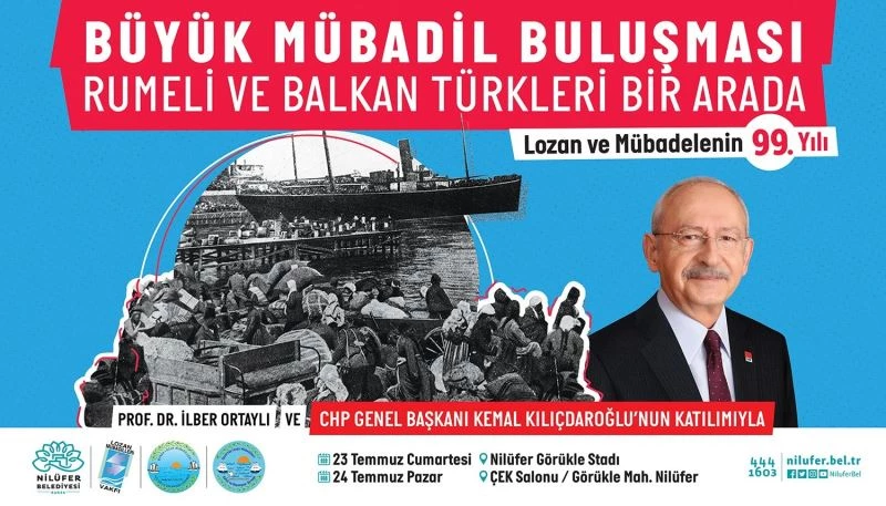 CHP Genel Başkanı Kemal Kılıçdaroğlu, Lozan Barış Antlaşması’nın 99.yılında Nilüfer’de düzenlenecek olan ’Büyük Mübadil Buluşması’nda, Rumeli ve Balkan Türkleri Sivil Toplum Kuruluşlarıyla bir araya gelecek.