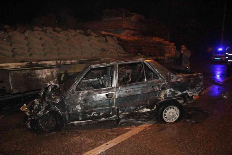 Kilis’e otomobil tıra arkadan çarptı. Otomobildeki 3 kişi çıkartıldıktan sonra otomobil alev alev yandı.