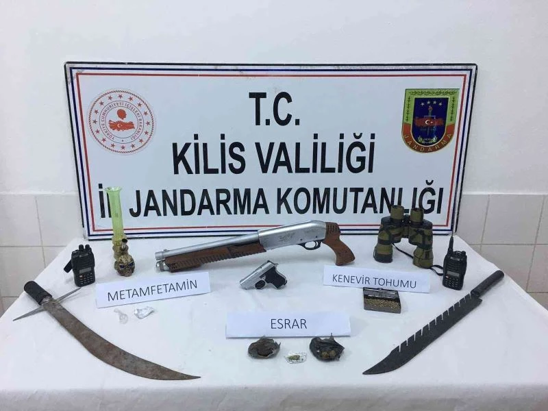 Kilis İl Jandarma Komutanlığı ekipleri, tarafından Mehmet Abdi Bulut mahallesinde bulunan bağ evinde uyuşturucu madde ticareti ve kullanımının tespitine yönelik yapılan istihbarı çalışmalar neticesinde icra edilen aramada, 15 gram kubar esrar,2 gram metamfetamin uyuşturucu madde, 20 gram kenevir tohumu, 3 adet uyuşturucu madde kullanma aparatı,1 adet ruhsatsız tabanca, 1 adet ruhsatsız av tüfeği, 2 adet pala, 1 adet gündüz görüş dürbünü ve 2 adet el telsizi ele geçirildi.