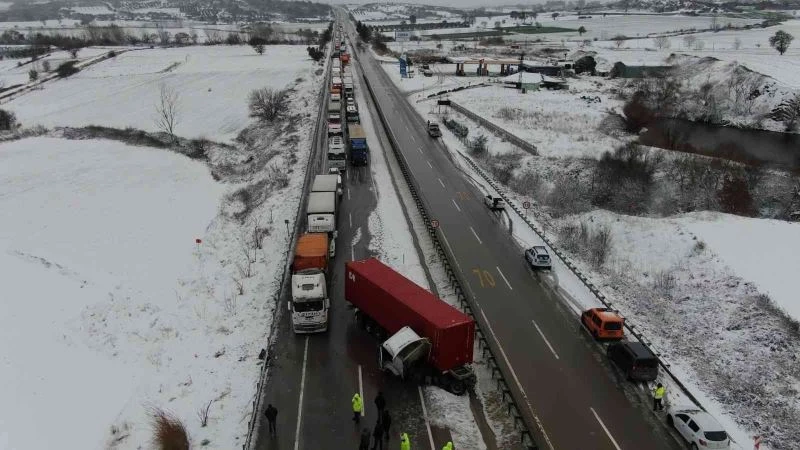 Bursa’da kar yağışı sebebiyle iki tırın karıştığı kaza Bursa-İzmir karayolunun saatlerce kapanmasına sebep oldu. Oluşan araç kuyruğu dronla havadan görüntülendi.