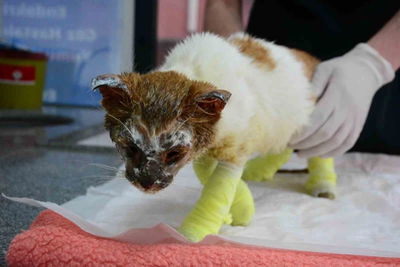 Kediyi beyaz ve yapışkan bir kimyasaldan arındırarak tedavi altına aldıklarını belirten Anaç, “Hasar vücudun sağ tarafından oluşmuş. Çünkü sol iki bacak daha inik ve daha az ödemliyken sağ taraf daha ödemli ve şiş. Sağ tarafında damar dolaşımı daha çok bozulmuş durumda. Vücudun sağ bölgesinden bir kimyasala girdiğini düşünüyoruz. Beyaz yapışkan bir kimyasaldı. Yıkadık ve çıkardık. Yüzünden, vücudundan arındırdık. Sadece yara bölgelerindeki hasarlarla uğraşıyoruz. Genel psikolojik durumumuz daha iyi. Hayati tehlike bugün de biraz var. Fakat tedavilerimize güzel bir cevap verdiği için, ufak ufak sıvı mamalarla beslenmeye cevap verdiği için hayati tehlike daha da azalıyor” diye konuştu.