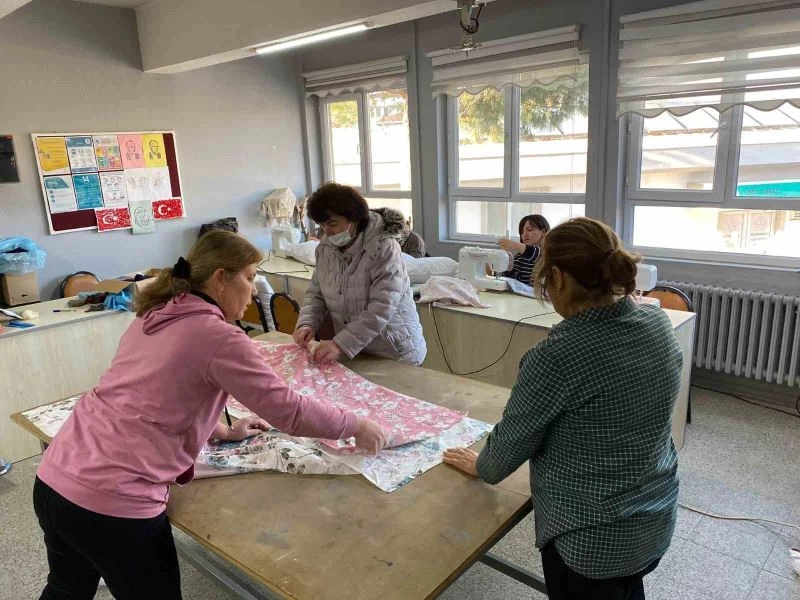 Kiraz Halk Eğitimi Merkezi öğretmenleri, usta öğreticileri ve kursiyerleri, deprem bölgesine kurulan sahra hastanesi için yastık üretiyor.