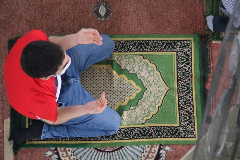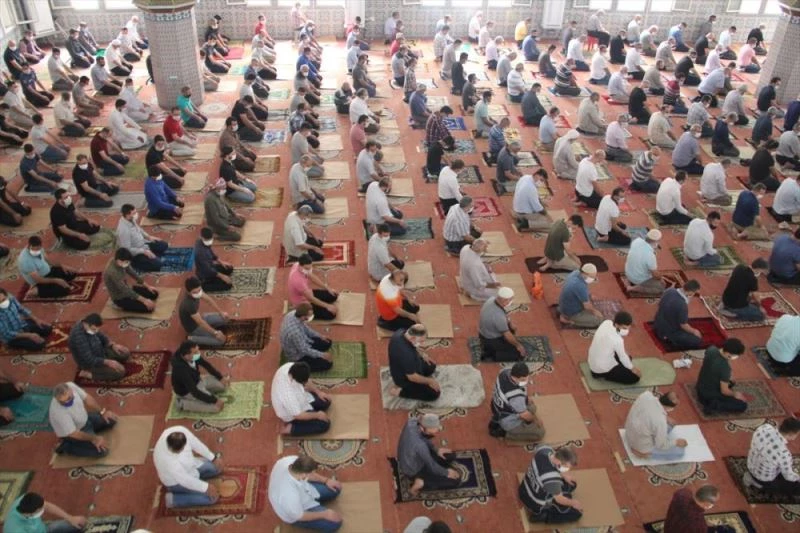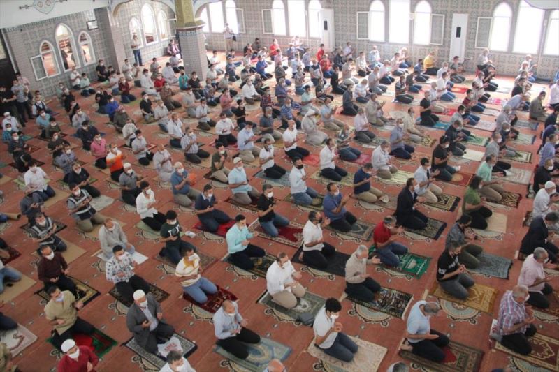 Sosyal mesafe kurallarına uyan ve maske takan vatandaşlar camide saf tuttu.