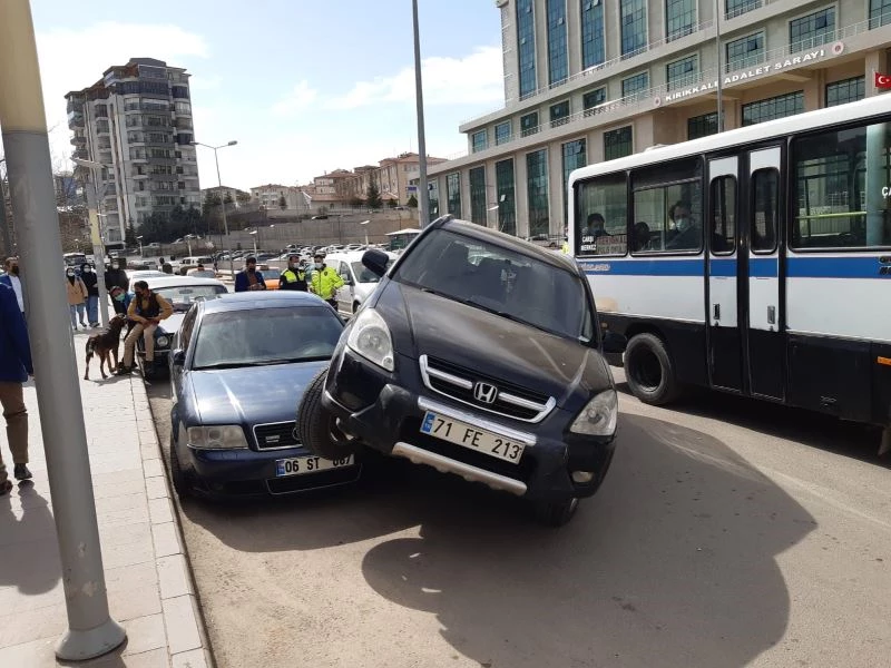 Kırıkkale’de ilginç kaza, cip park halindeki otomobilin üzerine çıktı
