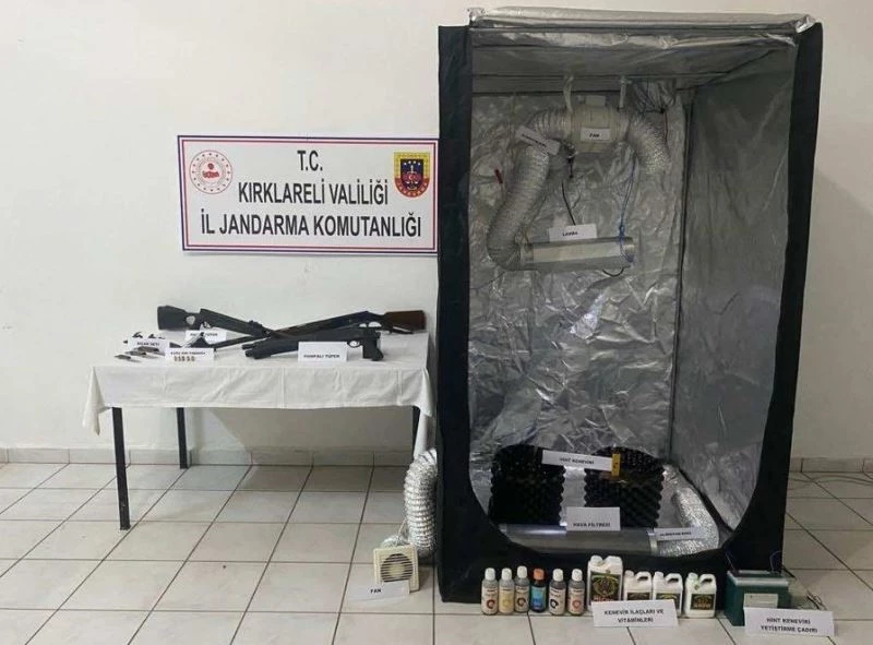 Şüphelilerin evlerinde yapılan aramada iklimlendirme sistemi, 2 kök kenevir, 3 hava filtresi, aspiratör, iç mekan çadırı, pompalı tüfek, av tüfeği, kurusıkı tabanca ile 3 bıçak ele geçirildi.