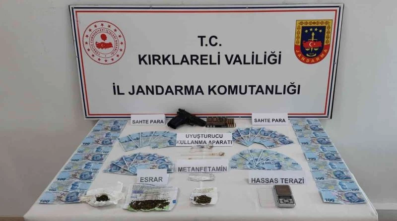 Alınan bilgiye göre, Babaeski ilçesinde piyasaya sahte para ve uyuşturucu sürüldüğü bilgisine ulaşan jandarma ekipleri çalışma başlattı. İl Jandarma Komutanlığı Kaçakçılık ve Organize Suçlarla Mücadele Şubesi ekipleri şüphelinin evine operasyon düzenledi. Operasyonda 100 liralık sahte 50 banknot, 12,21 gram kubar esrar, 13,89 gram metamfetamin, hassas terazi, 3 yeşil reçeteye tabi hap ile silah ele geçirildi.