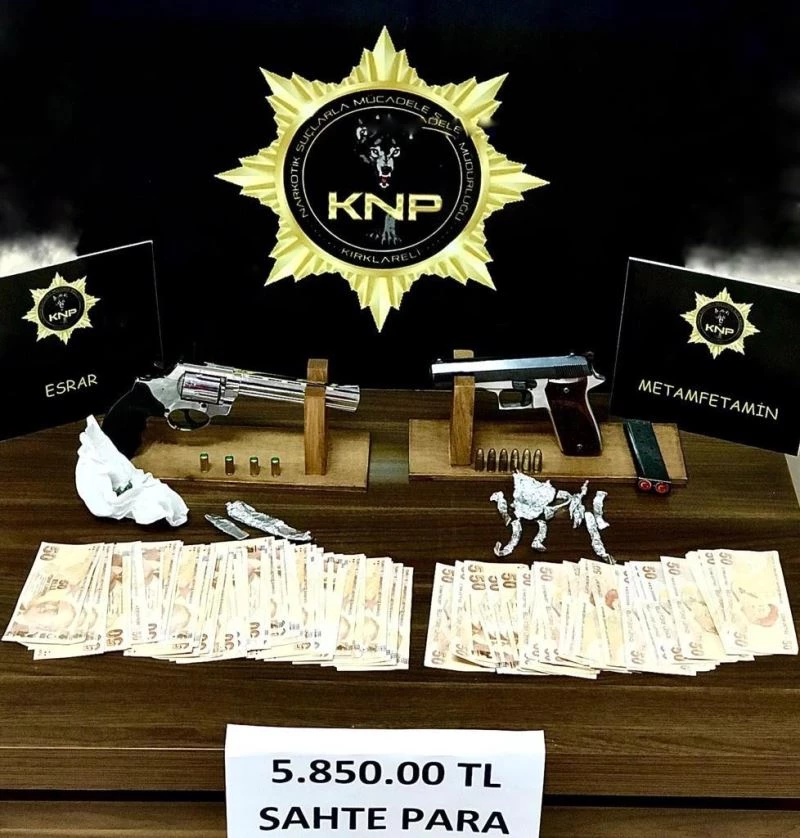 Kırklareli ve İstanbul’da düzenlenen eş zamanlı uyuşturucu operasyonunda uyuşturucu ticareti yaptığı iddia edilen 6 şüpheli gözaltına alındı. Yapılan aramalarda çeşitli miktarlarda uyuşturucu ve 4 silah, 13 mermi ile 117 sahte 50 liralık banknot ele geçirildi.