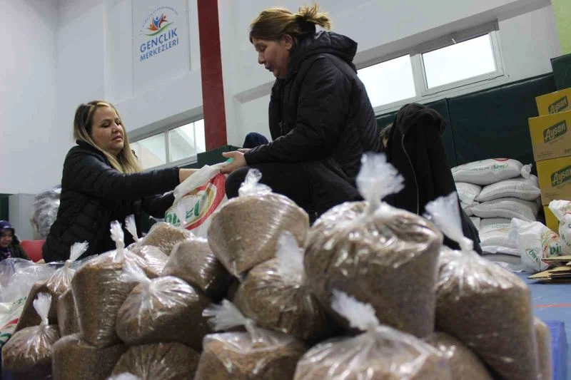 Depremzedelere yardım toplama merkezi olarak oluşturulan Gençlik Merkezinde bu gün hayırseverler tarafından bağışlanan 5 ton mercimek, 5 ton pirinç, 5 ton nohut, 5 ton bulgur ve 3 bin şişe yağ gönderilmek üzere paketleniyor.
