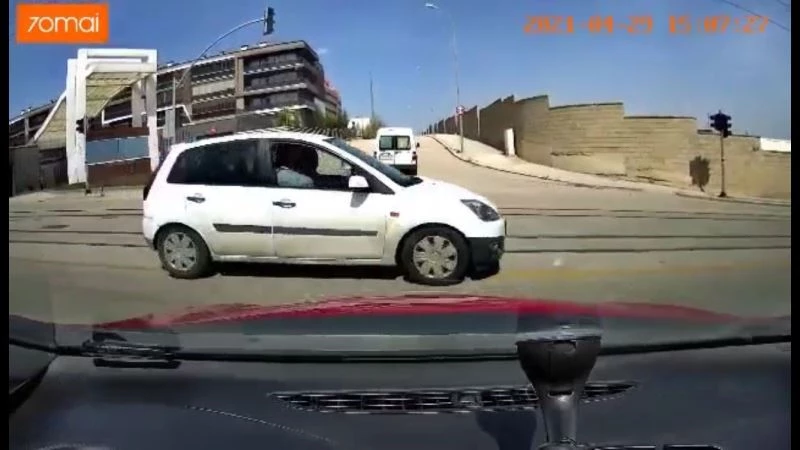 Eskişehir’de kırmızı ışık yanmasına rağmen yoluna devam eden otomobil sürücüsünün, kazadan kıl payı kurtulma anı araç kamerasına yansıdı.