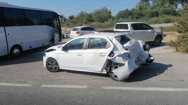 Kaza, Antalya-Manavgat D-400 Karayolu’nda meydana geldi. Edinilen bilgiye göre, İlkay G.’nin kullandığı 07 FYZ 13 plakalı tur midibüsü, Çolaklı Jandarma Kavşağı’na geldiği sırada, kırmızı ışıkta bekleyen Alper Şentürk’ün kullandığı 34 CMA 155 plakalı otomobile arkadan çarptı. Çarpmanın şiddetiyle otomobil, öndeki 07 ATS 882 plakalı Sinan Öz’ün kullandığı araca çarptı. Kazada bir araç hurdaya dönerken, şans eseri kimsenin burnunun bile kanamadı.