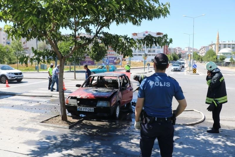 Sivas’ta kırmızı ışıkta beklediği sırada otomobilinde patlama meydana gelen sürücü neye uğradığını şaşırdı, otomobil kısa sürede alevler içinde kaldı.