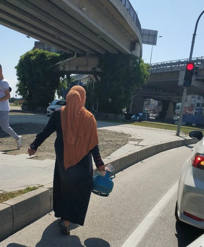 Samsun’da bir kadının kırmızı ışıkta duran araç sürücülerinden elinde ’piknik tüpü’ ve ’elektrik faturası’ ile dolaşıp dilenmesi dikkat çekti.