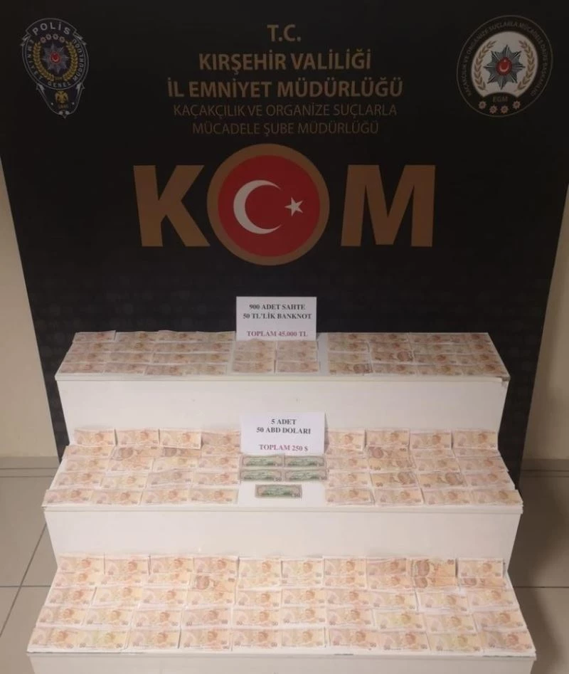 Kırşehir polisi tarafından düzenlenen operasyonda, 900 adet 50 liralık 45 bin lira, 5 adet 50 dolar 250 sahte banknot ele geçirilirken, bir kişi de gözaltına alındı.