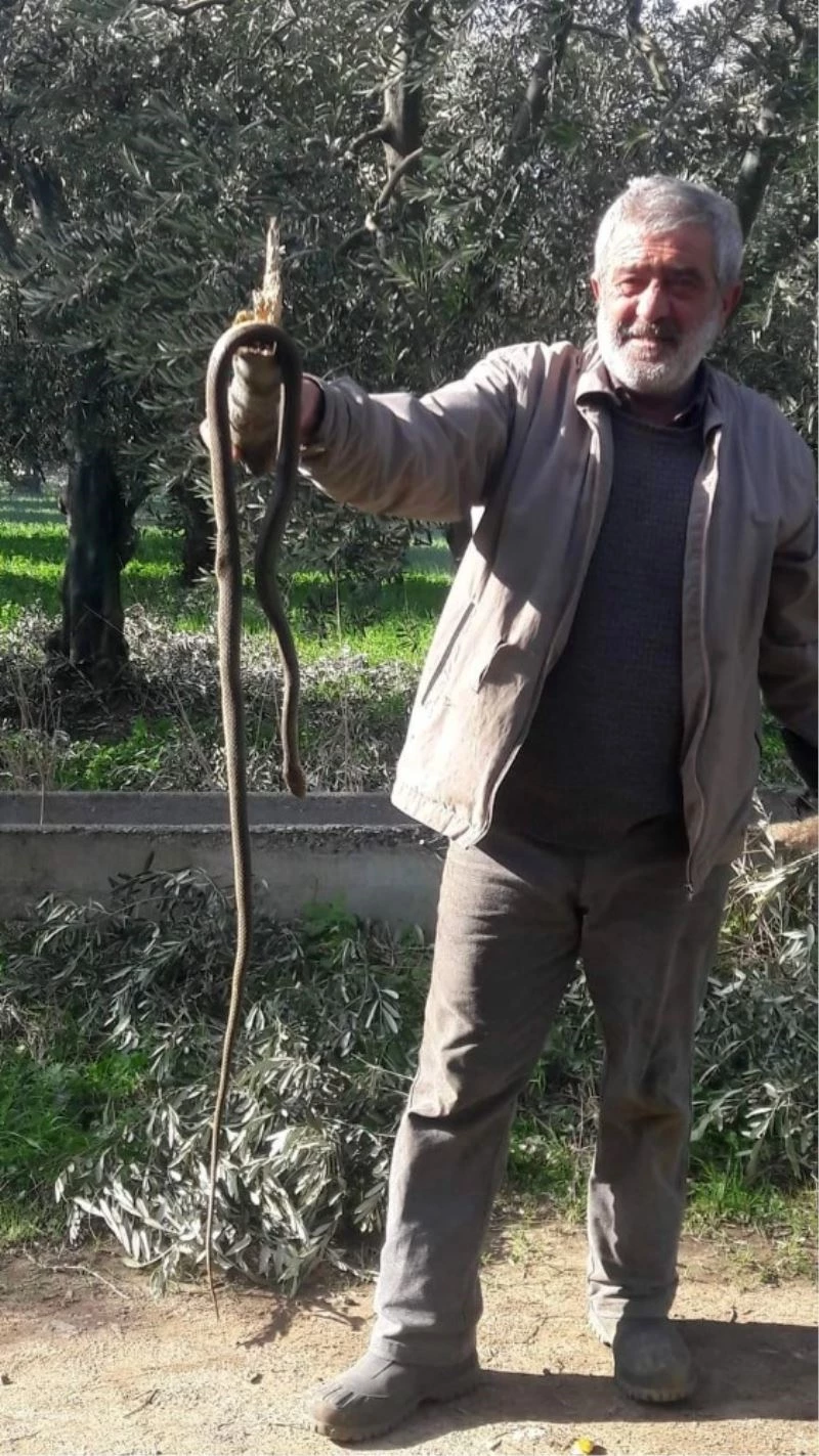 İznik ilçesine bağlı Çamdibi Mahallesi’nde tarlasını süren Şaban Yavaş (50), 2 metre boyundaki yılan ile karşılaşınca panik yaşadı. Yavaş, elindeki sopa ile hayvanı etkisiz hale getirdi. Daha sonra baygın olan yılanla fotoğraf çekinen Yavaş, yılanı yeniden doğal hayatına saldı.