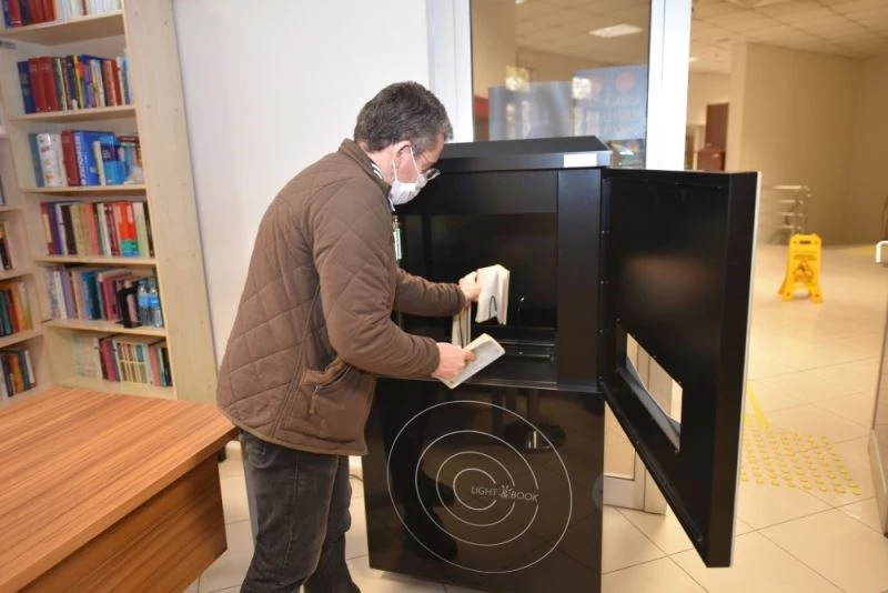 Merkez Süleyman Çelebi ve Ahmet Keleşoğlu Kütüphanesinde iki aydır kullanımda olan Ultraviyole Kitap Temizleme Cihazı bir dakikalık bir sürede 3kitabı temizleyerek kullanıma sunuyor. Yapılan açıklamada, “Maskesiyle kütüphaneye giren okuyucumuz, sosyal mesafe kuralına uyarak kitabını seçiyor. Seçilen kitabı görevli memurumuz okuyucuya vermeden önce sterilize makinesinde dezenfekte ediliyor. Ayrıca okuyucunun getirdiği kitap da sterilize makinesinde dezenfekte edildikten sonra rafa konuluyor. Etüt salonlarımızda da çalışma masaları arasına sosyal mesafe kurallarını uygulayarak çalışma ortamını tesis ettik” denildi.