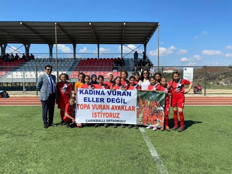 Öğrencilerin sosyal ve sportif faaliyetlerini daha aktif bir şekilde yerine getirebilmesi için çeşitli projeler yapan Kula İlçe Milli Eğitim Müdürlüğü, okullar arası kız futbol turnuvası başlattı. Yaklaşık 1 ay önce başlayan kız futbol turnuvasında grup maçları, bugün itibari ile sona erdi. Renkli görüntülere sahne olan grup maçlarını namağlup tamamlayan Çarıkballı İlköğretim Kurumları, gruptaki son maç seremonisine kadına yönelik şiddete dikkat çekmek amacıyla bir pankartla çıktı. "Kadına vuran eller değil, topa vuran ayaklar istiyoruz" yazılı pankartla sahaya çıkan minik kızların bu davranışı büyük beğeni topladı.