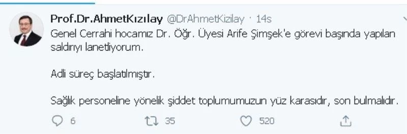 Rektör Kızılay, “Turgut Özal Tıp Merkezi Genel Cerrahi Ana Bilim Dalı Öğretim Üyelerimizden Dr. Öğr. Üyesi Arife Şimşek’ e görevi başında iken hasta yakınları tarafından saldırıda bulunulduğu bize iletildi. Şimşek’in saldırı sonrasında odasına gidip kapıyı kilitlediğinden temas saldırısı olmadığı, bu nedenle gözaltına alınan yoktur. Ancak şahıslar hakkında şikayetçi olundu ve adli süreç başlatıldı” dedi.