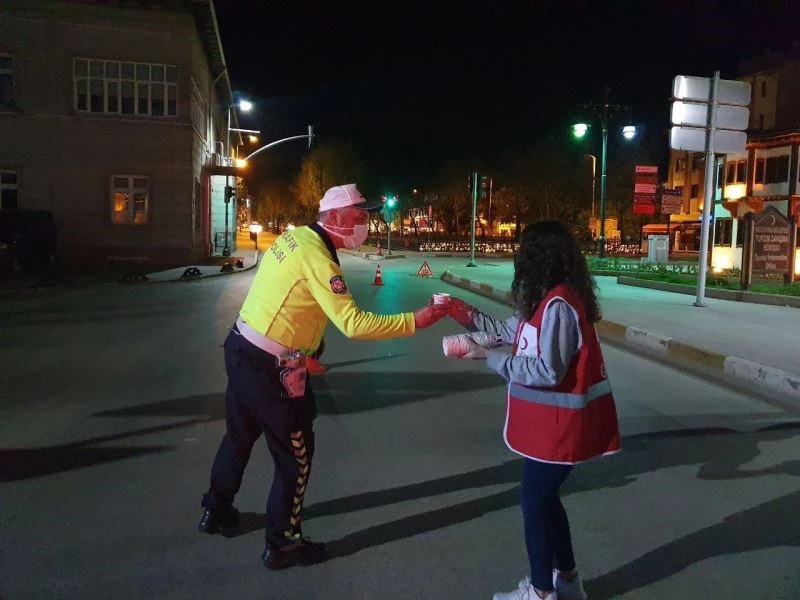 Kastamonu Genç Kızılay gönüllüleri, sahur vakti denetimlerini aksatmadan görevlerini yerine getiren polis ekiplerine çay ve çeşitli yiyecek ikramında bulundu.