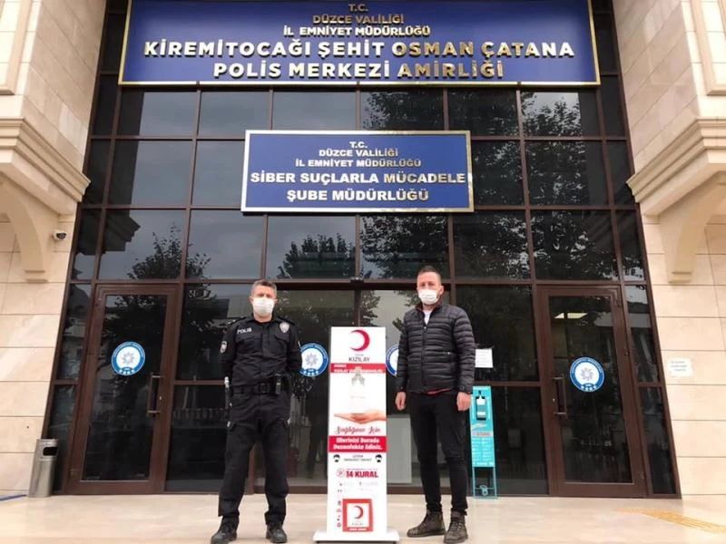 Korona virüs salgını sonrasında her bölgede dezenfektan stantları kurularak vatandaşlar için hijyen çalışması yapıldı. Türk Kızılay Düzce Şubesi de bu kapsamda vatandaşların yoğun olarak kullandığı resmi kurumlara dezenfektan standı ve dezenfekte desteğinde bulundu. Düzce’de okullara verilen stantlar ardından Düzce İl Emniyet Müdürlüğü ek binasına ve Çatana Polis karakolu ile Düzce Adliyesi’ne dezefektan standı Düzce Kızılay Şubesi tarafından verildi. Stantlar kurumlara yerleştirildi.