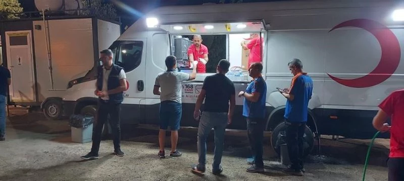 Afet uzmanları ve gönüllüleriyle bölgede 10 bin 54 kişilik sıcak yemek, çorba, kumanya, ekmek, ikram malzemesi, içecek ve su desteğinde bulunan Kızılay ekipleri, sabit noktalara gelemeyen çalışanlara da mobil ekipleriyle gıda malzemeleri ulaştırıyor. Türkiye Afet Müdahale Planlamasına göre afetlerde beslenme hizmetlerinin sorumlusu olan Kızılay, profesyonel ekipleri ve gönüllü kadrosuyla sabah ve akşam olmak üzere 5 bin 500 kişilik yemek çıkartıyor.