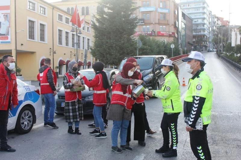 Türk Kızılayı Samsun Şubesi, sokağa çıkma kısıtlamasında görev yapan polis ekiplerine çeşitli ikramlarda bulundu.