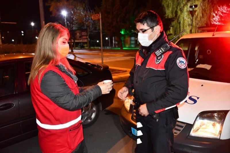 Aksaray’da sokağa çıkma kısıtlamasında cadde ve sokaklarda görev alarak uygulama ve denetimler yapan polis ekiplerine Türk Kızılay’ı tarafından kahve ve çay servisi yapıldı.