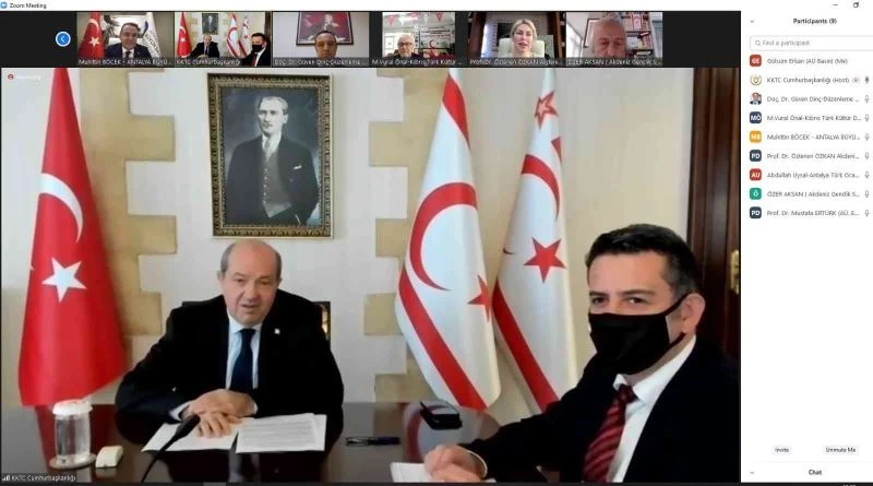 Akdeniz Üniversitesi ev sahipliğinde Antalya Büyükşehir Belediyesi ve Sivil Toplum Kuruluşları iş birliği ile düzenlenen ‘Kıbrıs’ın Fethinin 450. Yılı Uluslararası Sempozyumu’ nedeniyle KKTC Cumhurbaşkanı Ersin Tatar ve sempozyum paydaşlarının katılımıyla çevrim içi değerlendirme toplantısı düzenlendi. Toplantıya Antalya Büyükşehir Belediyesi Muhittin Böcek, Akdeniz Üniversitesi Rektörü Prof. Dr. Özlenen Özkan, Edebiyat Fakültesi Dekanı Prof. Dr. Mustafa Ertürk, Edebiyat Fakültesi Dekan Yardımcısı Doç. Dr. Güven Dinç, Kıbrıs Türk Kültür Derneği Antalya Şube Başkanı M. Vural Önal, Akdeniz Gençlik Sanat Araştırma ve Eğitim Derneği Özer Satılmış Özgüç, Antalya Türk Ocakları Başkanı Abdullah Uysal katıldı.