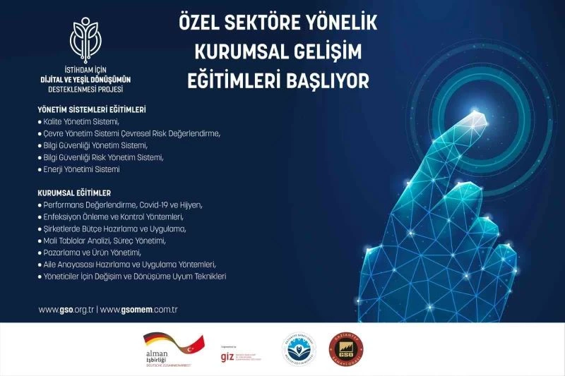 Gaziantep Sanayi Odası (GSO) ve Alman Uluslararası İş Birliği Kurumu (GIZ) ortaklığında yürütülen, Alman Federal Ekonomik İş Birliği ve Kalkınma Bakanlığı (BMZ) tarafından finanse edilen İstihdam İçin, “Dijital ve Yeşil Dönüşümün Desteklenmesi Projesi” kapsamında KOBİ Gelişim Eğitimleri başlıyor. Yönetim sistemleri olarak, “Kalite Yönetim Sistemi, Çevre Yönetim Sistemi Çevresel Risk Değerlendirme, Bilgi Güvenliği Yönetim Sistemi, Bilgi Güvenliği Risk Yönetim, Enerji Yönetimi Sistemi” eğitimleri verilecek.