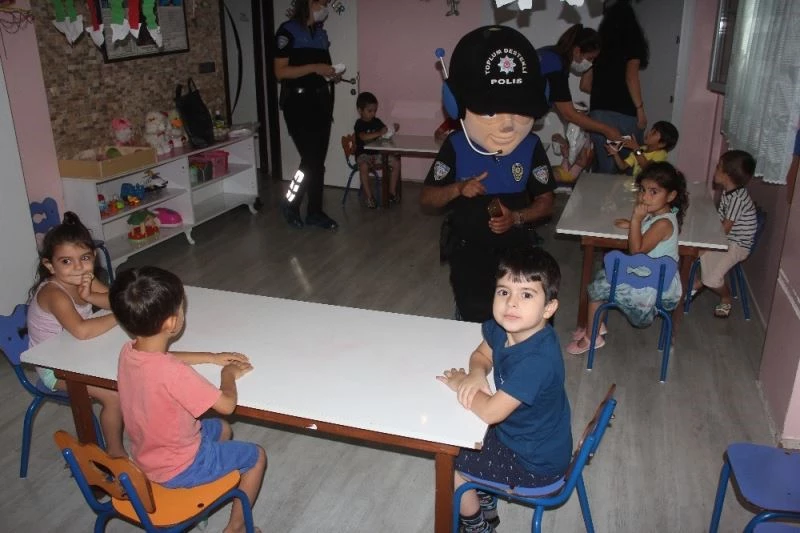Adana Emniyet Müdürlüğü Toplum Destekli Polislik Şube Müdürlüğü ekipleri, kreşleri gezerek çocuklara maske dağıtıp yeni tip korona virüse karşı nasıl önlem alacakları konusunda eğitim verirken, ’koca kafa kanka polis’ de, minikleri eğlendirdi.