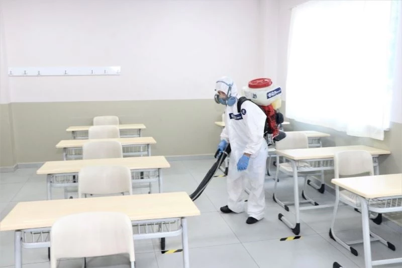 Büyükşehir Belediyesi ekiplerince okulların giriş kapısı, çocukların elleriyle dokunabilecekleri kapı kolları ve çerçeveleri, merdivenler, korkuluklar, sınav olacakları sınıflar, oturacakları sıralar, öğretmen masaları, pencere kolları ve lavabolar dezenfekte edildi.