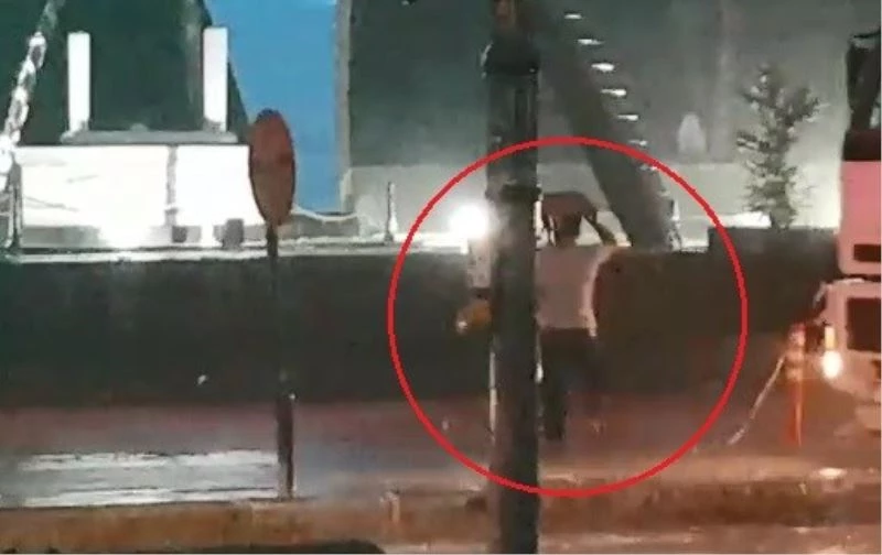 Görüntülerde yoldan geçmeye çalışan bir şahıs bir yandan ıslanmamak için elindeki çanta ile başını kapatırken bir yandan da seyir halindeki araçları kolluyor. Araçların gelmediğini gören şahıs, adımını atar atmaz yağmur suyu ile dolan çalışma alanına düşüyor. Boyuna kadar suya gömülen şahıs, olayın şoku ile aniden sudan çıkıyor. O anları görüntüleyen vatandaşlar ise bir süre güldükten sonra diğer yayaları uyararak karşıya geçmemeleri için bağırıyor.