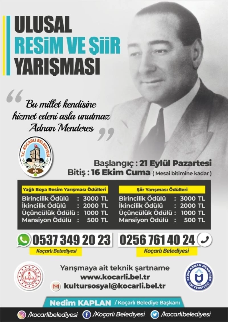 17 Eylül 1961’de haksız ve hukuksuz bir yargılama sonucunda dönemin darbe hükümetinin aldığı siyasi bir kararla idam cezasının infaz edilmesiyle hayata veda eden Aydın Koçarlı’lı Merhum Başvekil Adnan Menderes’in anısına şiir ve resim yarışması düzenlendi. Menderes’in hatırasını yaşatmak ve aynı zamanda memleketi Koçarlı’nın kent hafızasına katkı sağlamak için herkese açık bu yarışmayı düzenlediklerini belirten Koçarlı Belediye Başkanı Nedim Kaplan, yarışmaya katılacakların teknik şartnamenin www.kocarli.bel.tr adresinden edinilebileceğini söyledi.