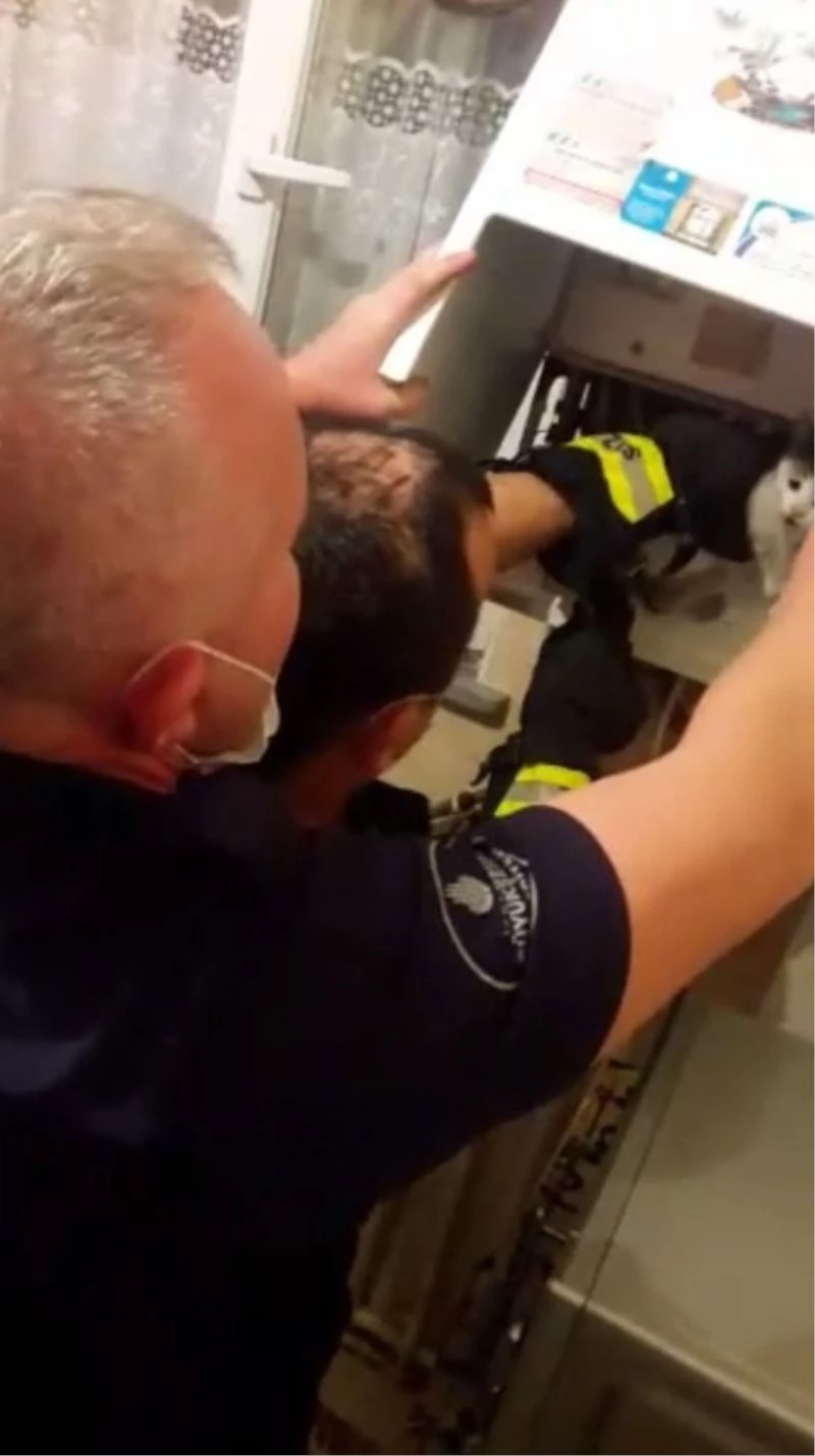 Arnavutköy’de bir dairenin kombisinin içine giren kedi kombiye sıkıştı. Uzun uğraşlar sonunda çıkarılan kedinin kurtarılma anı cep telefonu kamerasına yansıdı.
