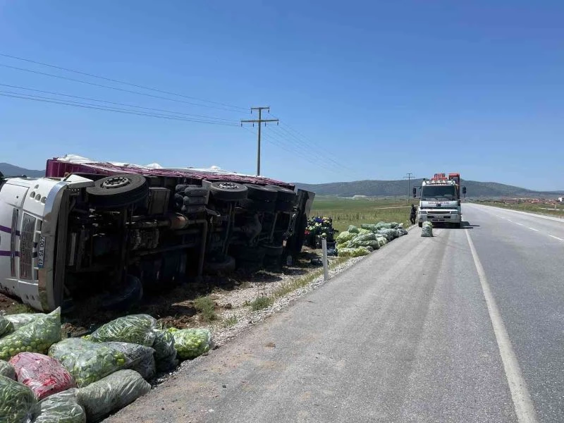 Afyonkarahisar’da devrilen dolmalık biber yüklü kamyonun sürücüsü şans eseri kazayı yara almadan atlattı.