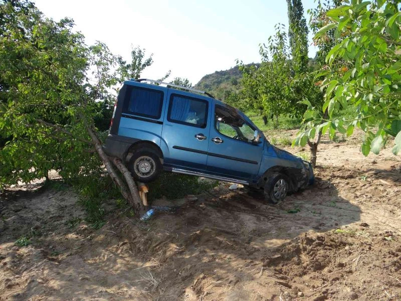 Kontrolden çıkan hafif ticari araç kiraz bahçesine uçtu