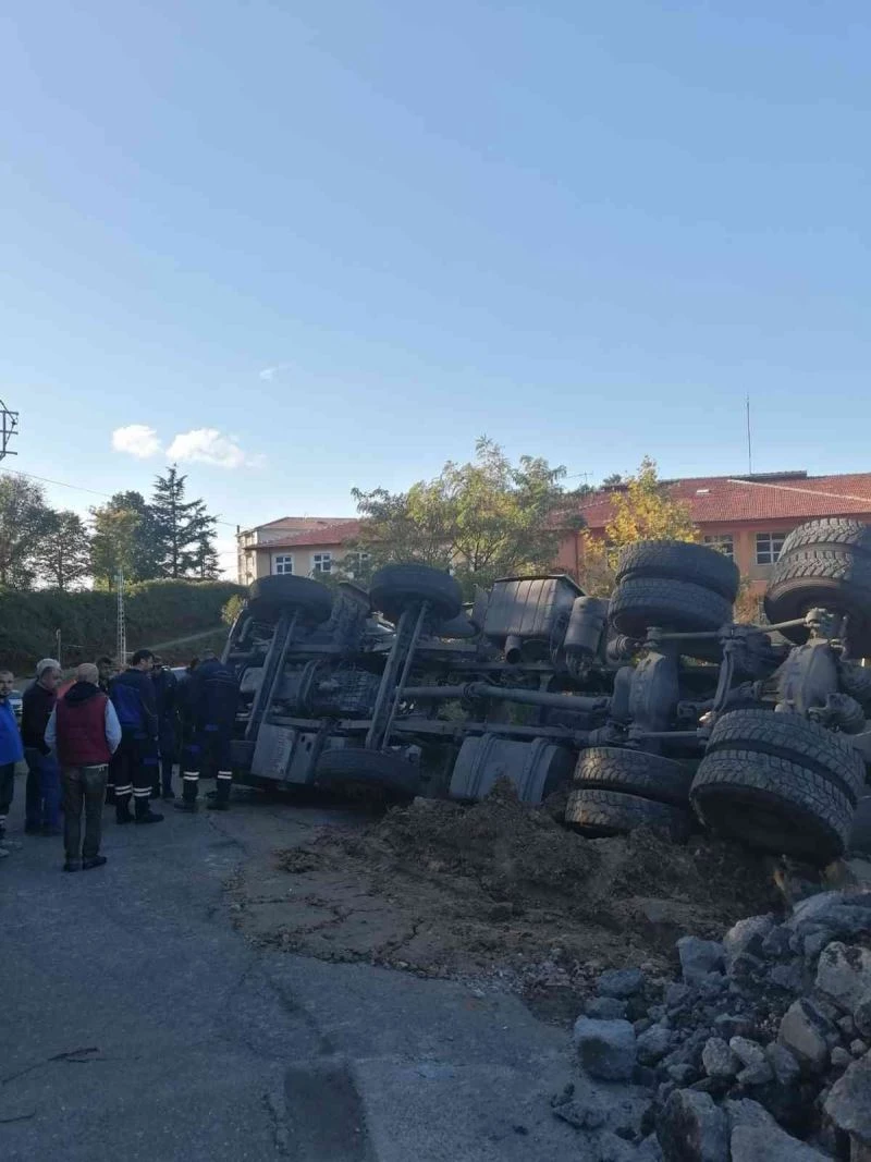 Zonguldak’ta İnağzı Mahallesi’nde sürücüsünün kontrolden çıkan hafriyat kamyonu devrildi. Kazada şans eseri yaralanan olmazken maddi hasar meydana geldi.