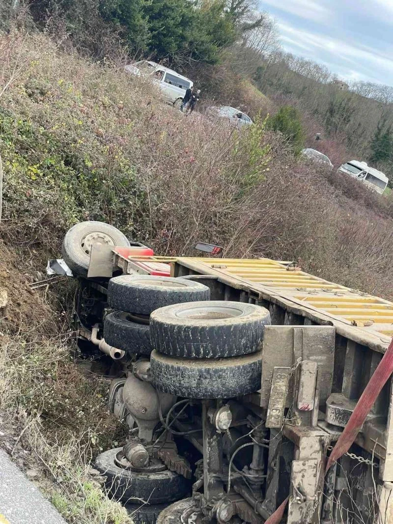 Sakarya’nın Kaynarca ilçesinde sürücüsünün kontrolünden çıkan kamyon yol kenarındaki boş araziye devrildi.
