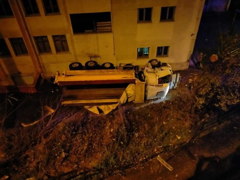 Zonguldak’ta kontrolden çıkan kum yüklü kamyon okulun bahçesine uçtu. Kazada 1 kişi yaralandı.