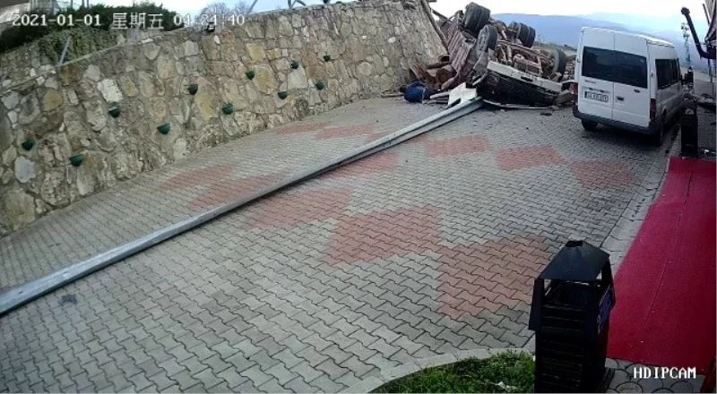 Öte yandan, meydana gelen kaza bölgede bulunan bir güvenlik kamerasınca saniye saniye kaydedildi. Görüntülerde; kontrolden çıkan kamyonun viraja girdiği esnada yan yatması ve bariyerleri aşarak bahçeye devrilmesi yer aldı. Daha sonrasında ise hurdaya dönen kamyondan sürücünün kendi çabaları sonucu çıkması görülüyor.