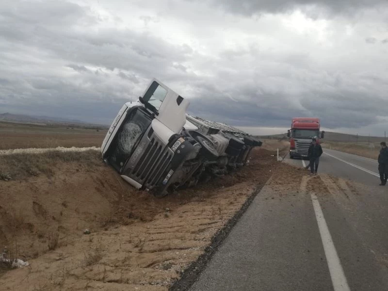 Kontrolden çıkan kum yüklü tır orta refüje devrildi