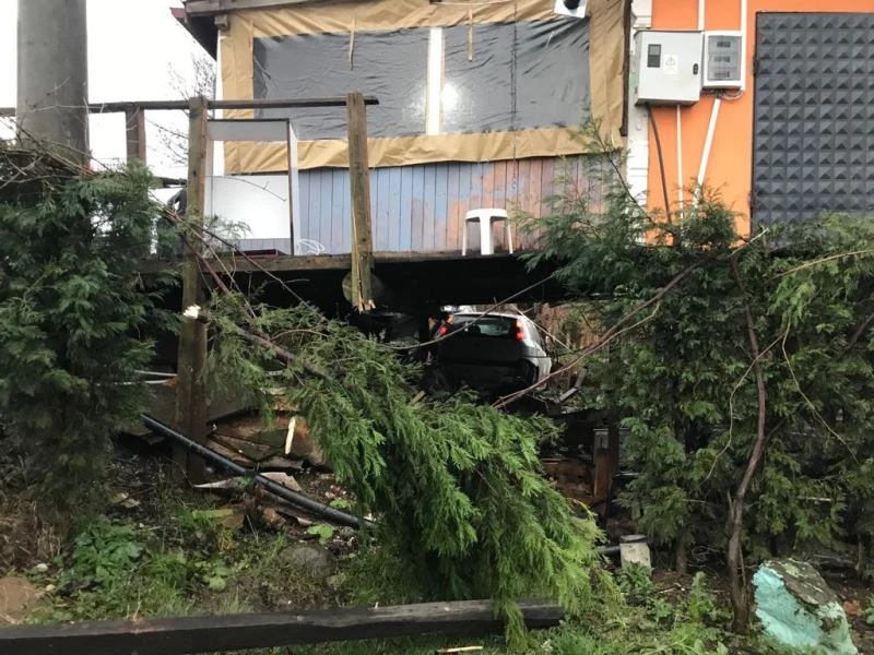 Kontrolden çıkan otomobil, barakanın altından geçerek ağaca çarptı