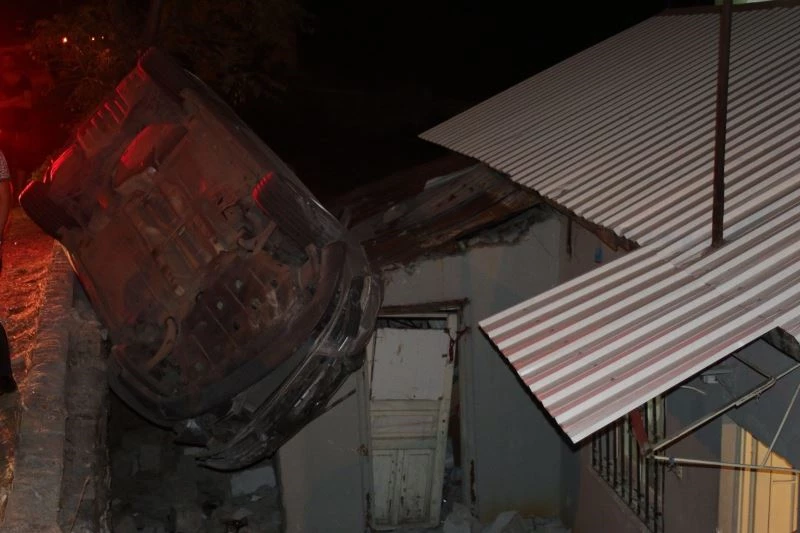 Hatay’ın Dörtyol ilçesinde kontrolden çıkan otomobil yolun kenarında bulunan evin çatısına düştü. Araçta bulunan 2 kişi yaralandı.