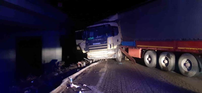 Öte yandan bariyerler arasına sıkışarak askıda kalan tır sebebiyle İzmir-Ankara D300 karayolunun İzmir istikametinde trafik kapandı. Karayolunda trafik akışı, tırın vinç yardımıyla kaldırılmasının ardından yeniden sağlanacak. Tırı kaldırma çalışmaları da sürüyor.