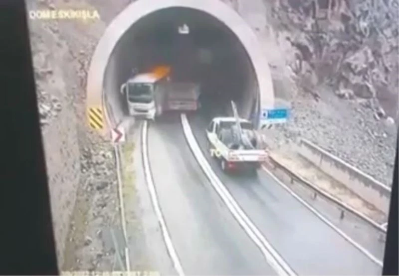 Artvin-Erzurum karayolu 25. kilometresinde tünele hızlı giren tır, karşıdan gelen yolcu otobüsüne çarptı. 6 kişinin yaralandığı kaza güvenlik kamerasına saniye saniye yansıdı.